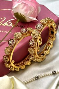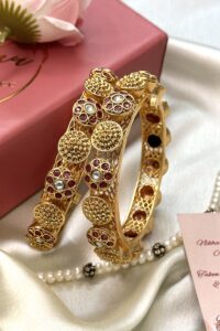 Our Gold Look bangles epitomize the fusion of exceptional quality, exquisite craftsmanship, and versatile elegance. Impeccably crafted, these bangles showcase intricate designs adorned with shimmering AD stones that emulate the brilliance of diamonds. With their timeless appeal, they effortlessly elevate any occasion, from weddings to special celebrations. Whether you seek to make a statement at formal events or add a touch of sophistication to your everyday attire, our AD bangles are the epitome of refined beauty. Indulge in their superior craftsmanship, embrace their versatility, and immerse yourself in the world of exquisite luxury. – When you choose to purchase from us, You are actively supporting artisans and craftsman, with special emphasis on empowering women in these industries.
