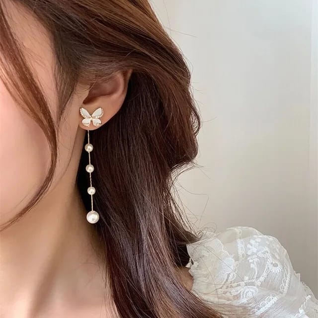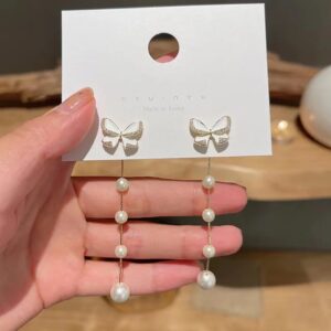 Butterfly Chain Pearls Silver Plated Korean Earrings