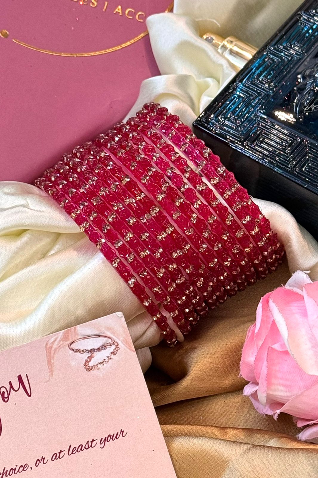In Indian tradition, glass bangles are considered highly auspicious, symbolizing prosperity, good fortune, and the divine blessings of Goddess Lakshmi. Wearing them daily is believed to attract positivity, enhance feminine grace, and invite abundance into life. On weddings, festivals, and special occasions, they hold even deeper significance—representing joy, harmony, and the eternal bond of tradition.