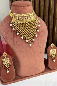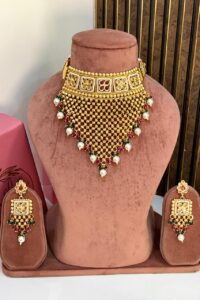 Be the first to review “Dubai Style Ruby Pearls Gold Polish Necklace With Earrings MaangTeeka”