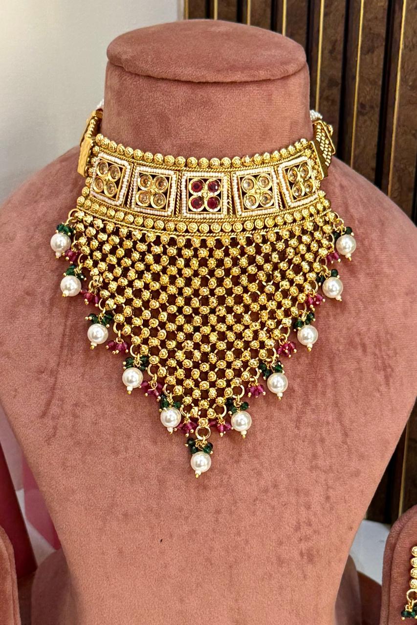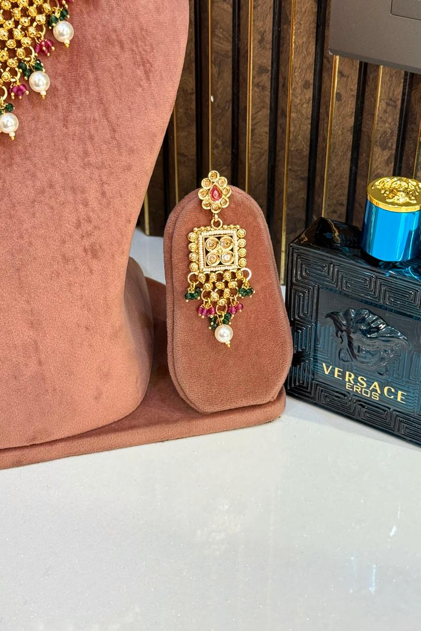 Dubai Style Ruby Pearls Gold Polish Necklace With Earrings MaangTeeka