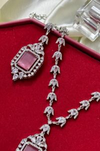 Introducing our exquisite AD (American Diamond) jewelry set, a stunning combination of elegance and glamour. This captivating set features a necklace and matching earrings, meticulously crafted with high-quality AD stones that sparkle brilliantly like real diamonds. The intricately designed necklace showcases a mesmerizing pendant, accentuated by shimmering stones, while the earrings beautifully complement the ensemble. The set exudes a timeless charm, perfect for enhancing any special occasion or adding a touch of sophistication to your everyday attire. With its impeccable craftsmanship and radiant allure, our AD jewelry set is a must-have for those seeking classic beauty and effortless glamour –Delivery Estimate: 3-12 Working Days from date of order7 Days no question asked return policy