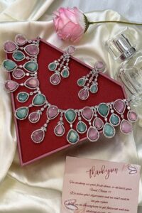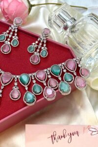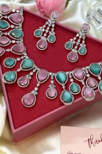 Introducing our exquisite AD (American Diamond) jewelry set, a stunning combination of elegance and glamour. This captivating set features a necklace and matching earrings, meticulously crafted with high-quality AD stones that sparkle brilliantly like real diamonds. The intricately designed necklace showcases a mesmerizing pendant, accentuated by shimmering stones, while the earrings beautifully complement the ensemble. The set exudes a timeless charm, perfect for enhancing any special occasion or adding a touch of sophistication to your everyday attire. With its impeccable craftsmanship and radiant allure, our AD jewelry set is a must-have for those seeking classic beauty and effortless glamour