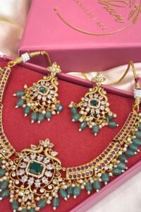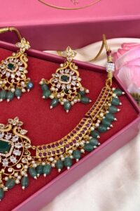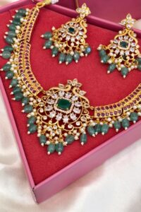 Introducing our exquisite AD (American Diamond) jewelry set, a stunning combination of elegance and glamour. This captivating set features a necklace and matching earrings, meticulously crafted with high-quality AD stones that sparkle brilliantly like real diamonds. The intricately designed necklace showcases a mesmerizing pendant, accentuated by shimmering stones, while the earrings beautifully complement the ensemble. The set exudes a timeless charm, perfect for enhancing any special occasion or adding a touch of sophistication to your everyday attire. With its impeccable craftsmanship and radiant allure, our AD jewelry set is a must-have for those seeking classic beauty and effortless glamour When you choose to purchase from us, You are actively supporting artisans and craftsman, with special emphasis on empowering women in these industries.</strong