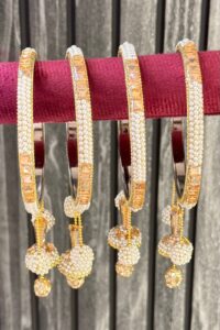 Our AD (American Diamond) bangles epitomize the fusion of exceptional quality, exquisite craftsmanship, and versatile elegance. Impeccably crafted, these bangles showcase intricate designs adorned with shimmering AD stones that emulate the brilliance of diamonds. With their timeless appeal, they effortlessly elevate any occasion, from weddings to special celebrations. Whether you seek to make a statement at formal events or add a touch of sophistication to your everyday attire, our AD bangles are the epitome of refined beauty. Indulge in their superior craftsmanship, embrace their versatility, and immerse yourself in the world of exquisite luxury. – When you choose to purchase from us, You are actively supporting artisans and craftsman, with special emphasis on empowering women in these industries.