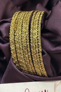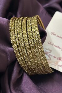 Our Rajwaada Bangles epitomize the fusion of exceptional quality, exquisite craftsmanship, and versatile elegance. Impeccably crafted, these bangles showcase intricate designs adorned with shimmering AD stones that emulate the brilliance of diamonds. With their timeless appeal, they effortlessly elevate any occasion, from weddings to special celebrations. Whether you seek to make a statement at formal events or add a touch of sophistication to your everyday attire, our AD bangles are the epitome of refined beauty. Indulge in their superior craftsmanship, embrace their versatility, and immerse yourself in the world of exquisite luxury.