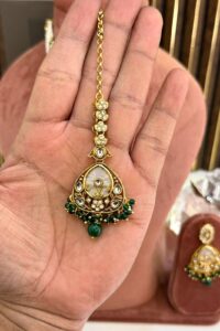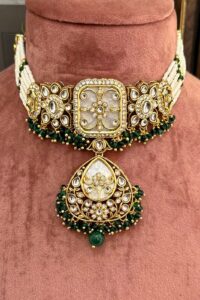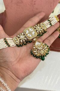 Be the first to review “Rivaayat-e-Nikhar Emerald Pearl Choker Set With Earrings And Maang Teeka”