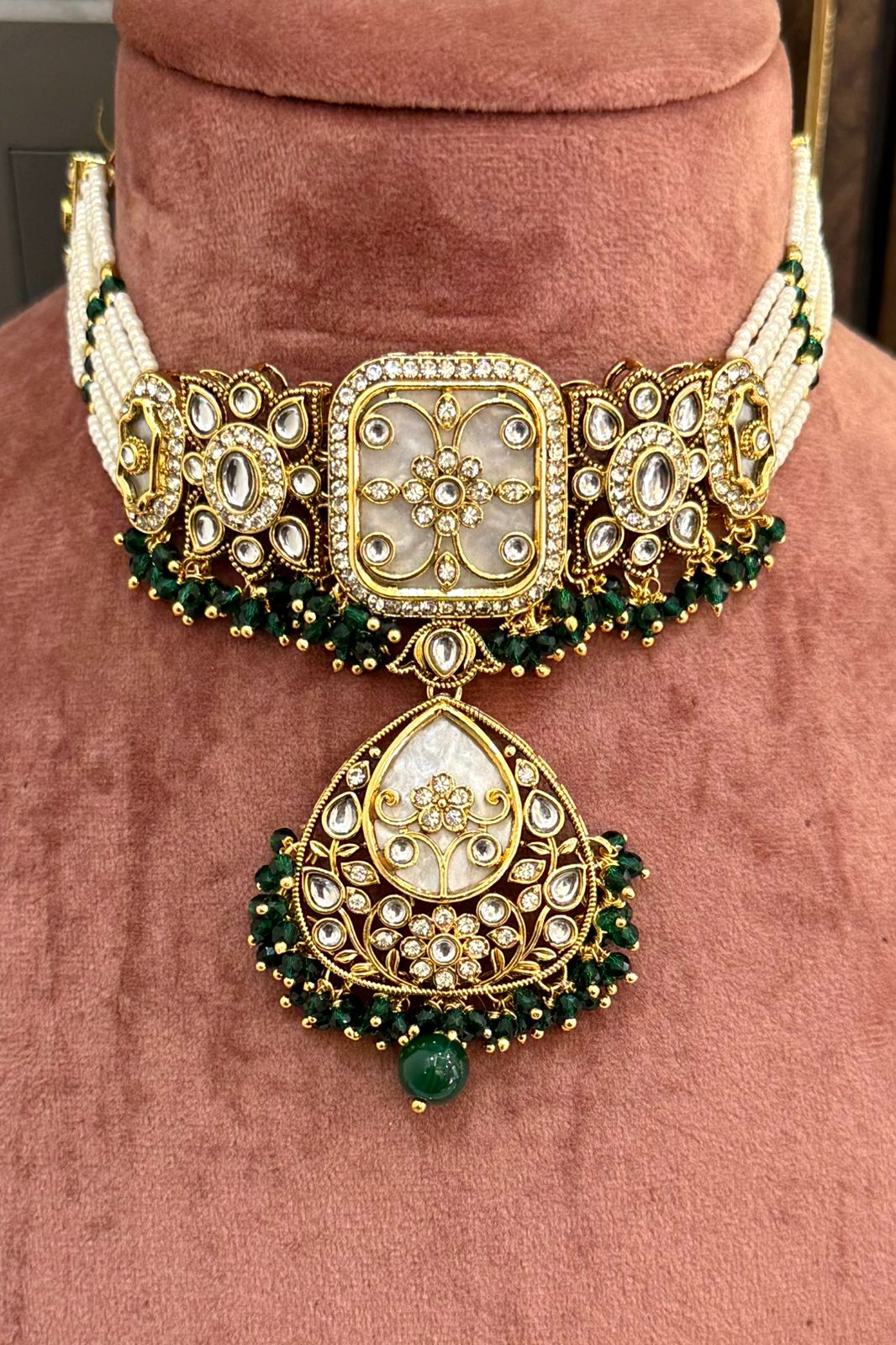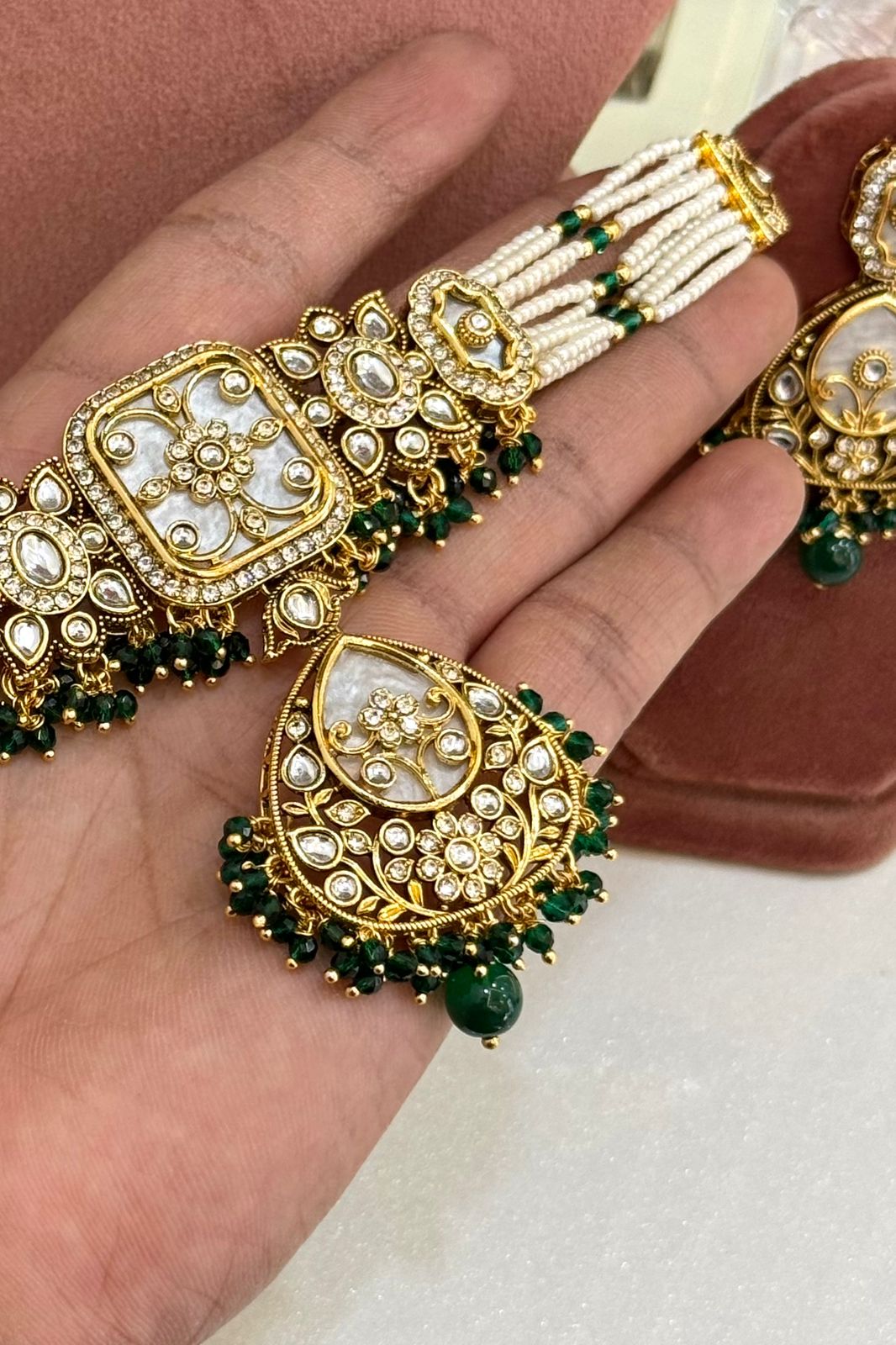 Rivaayat-e-Nikhar Emerald Pearl Choker Set With Earrings And Maang Teeka