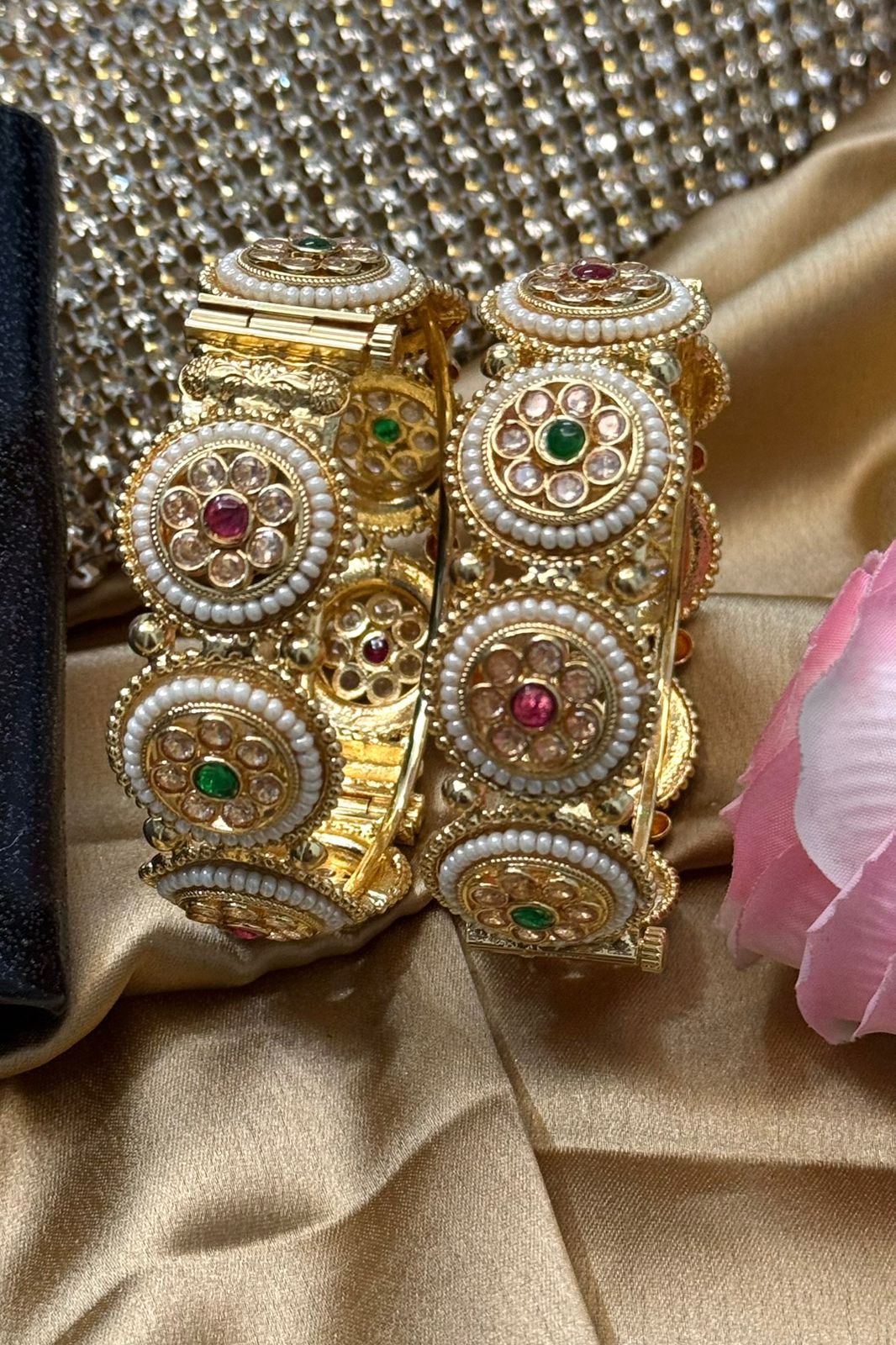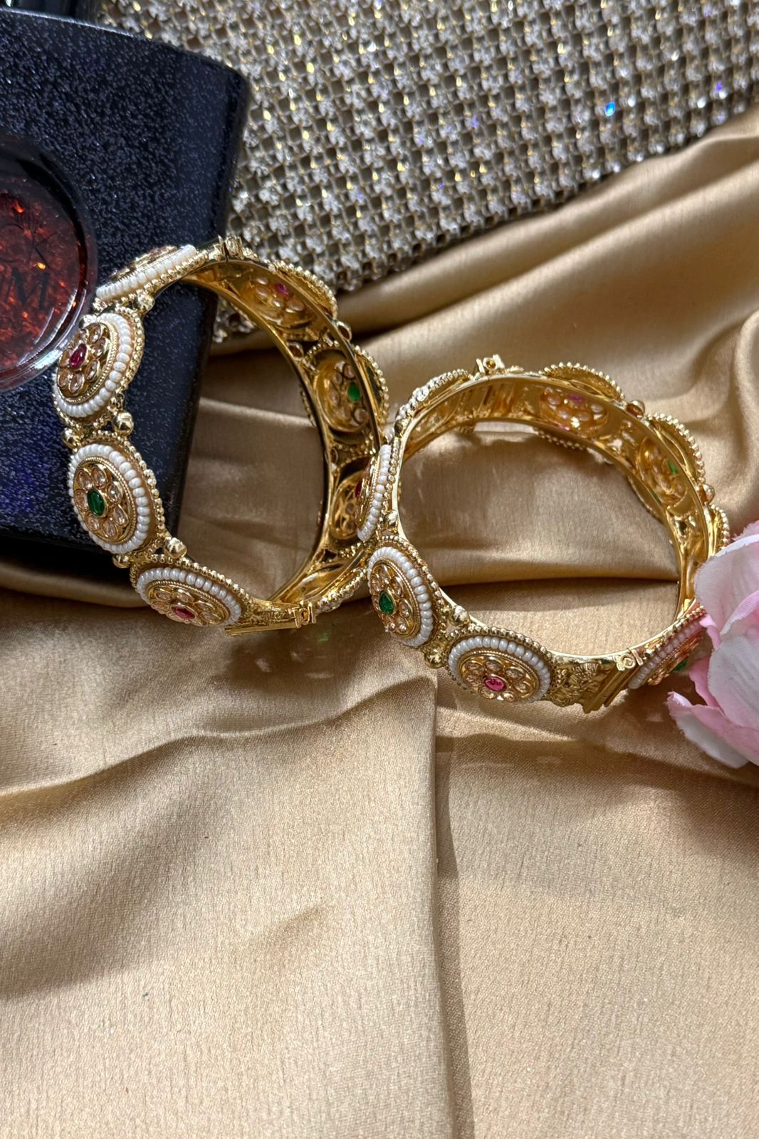 Shahi Polki Pearl Ruby Emerald Gold Bangles Set of 2 (Openable)