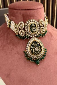 Be the first to review “Sunehri Pearl Edit Emerald Choker Set With Earrings And Maang Teeka”