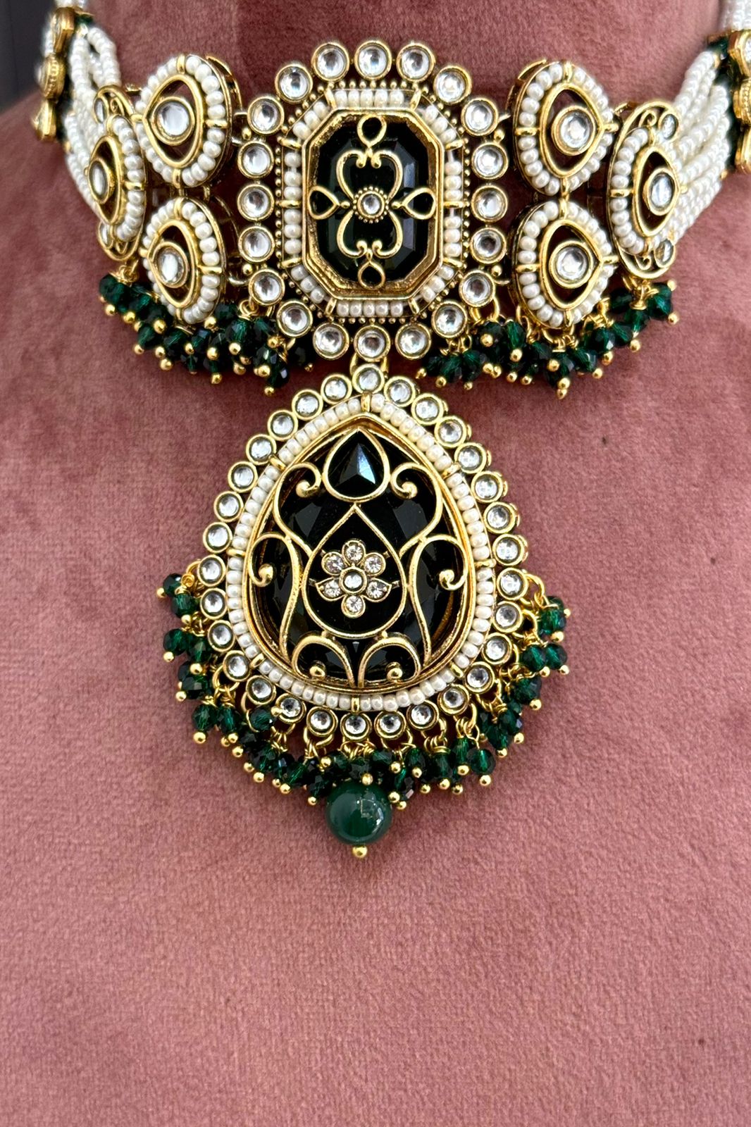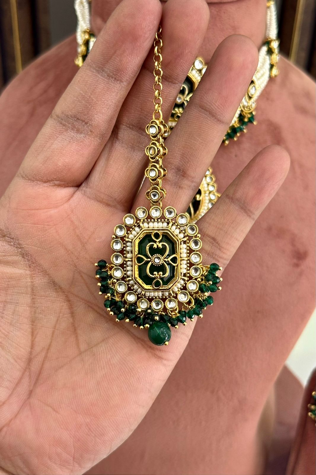 Sunehri Pearl Edit Emerald Choker Set With Earrings And Maang Teeka